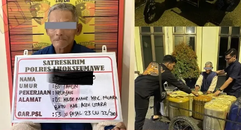 Pria tua ditangkap polisi sesaat mengisi Solar di SPBU di Gampong Dakuta, Kecamatan Muara Batu, pada Rabu (13/4/2022) malam. Petugas mendapati dalam becak motornya ada 13 jeriken berisi solar sebanyak 441 liter.